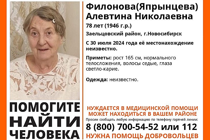 Добровольцы проверили 400 километров в поисках пенсионерки в НовосибирскеВ Новосибирске продолжаются поиски 78-летней жительницы Заельцовского района Алевтины Николаевны Филоновой (Япрынцевой).Страдающая провалами в памяти женщина ушла из дома 30 июля и до сих пор не вернулась. Подробнее…#ОБЩЕСТВО Перейти по ссылке