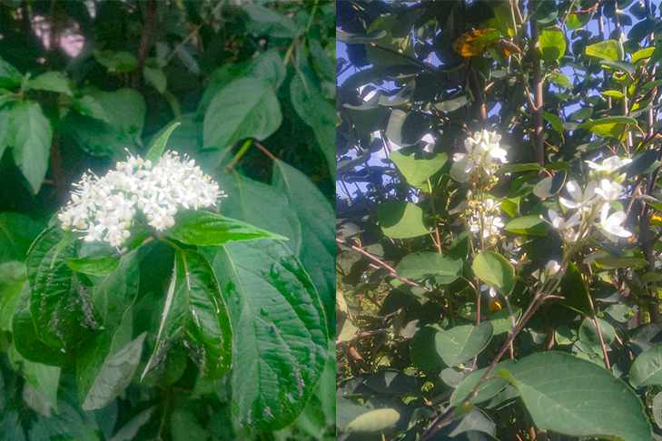 Роскошные цветы в неурочную осеннюю пору заметили на белом дерене и ирге.